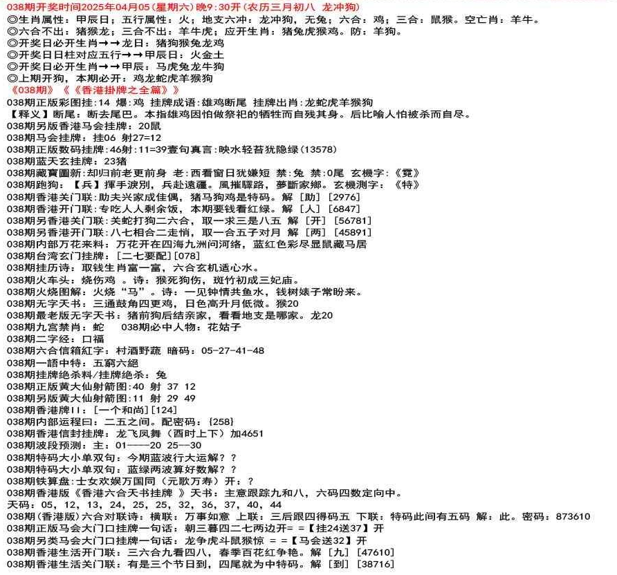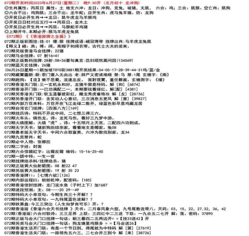 111期(香港版)六合对联诗:三三足养 上联:头在天上脚落地 下联:说是龙来假一字 解:落。密码:38729